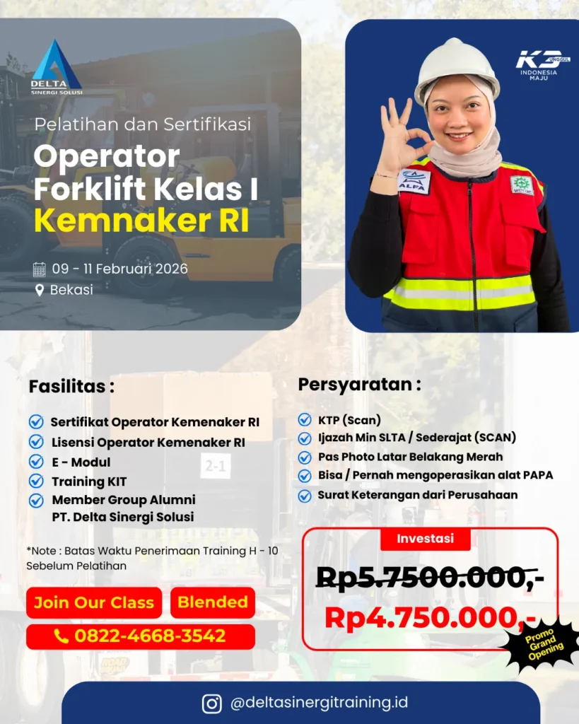 Seiring dengan meningkatnya standar keselamatan kerja di berbagai sektor industri, kebutuhan akan operator forklift yang memiliki kompetensi dan sertifikasi resmi menjadi semakin penting. Pelatihan Forklift Kelas I dirancang untuk memastikan setiap peserta memahami aspek teknis pengoperasian, prosedur keselamatan, serta regulasi K3 yang berlaku.